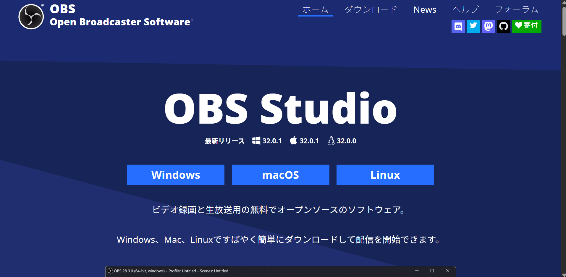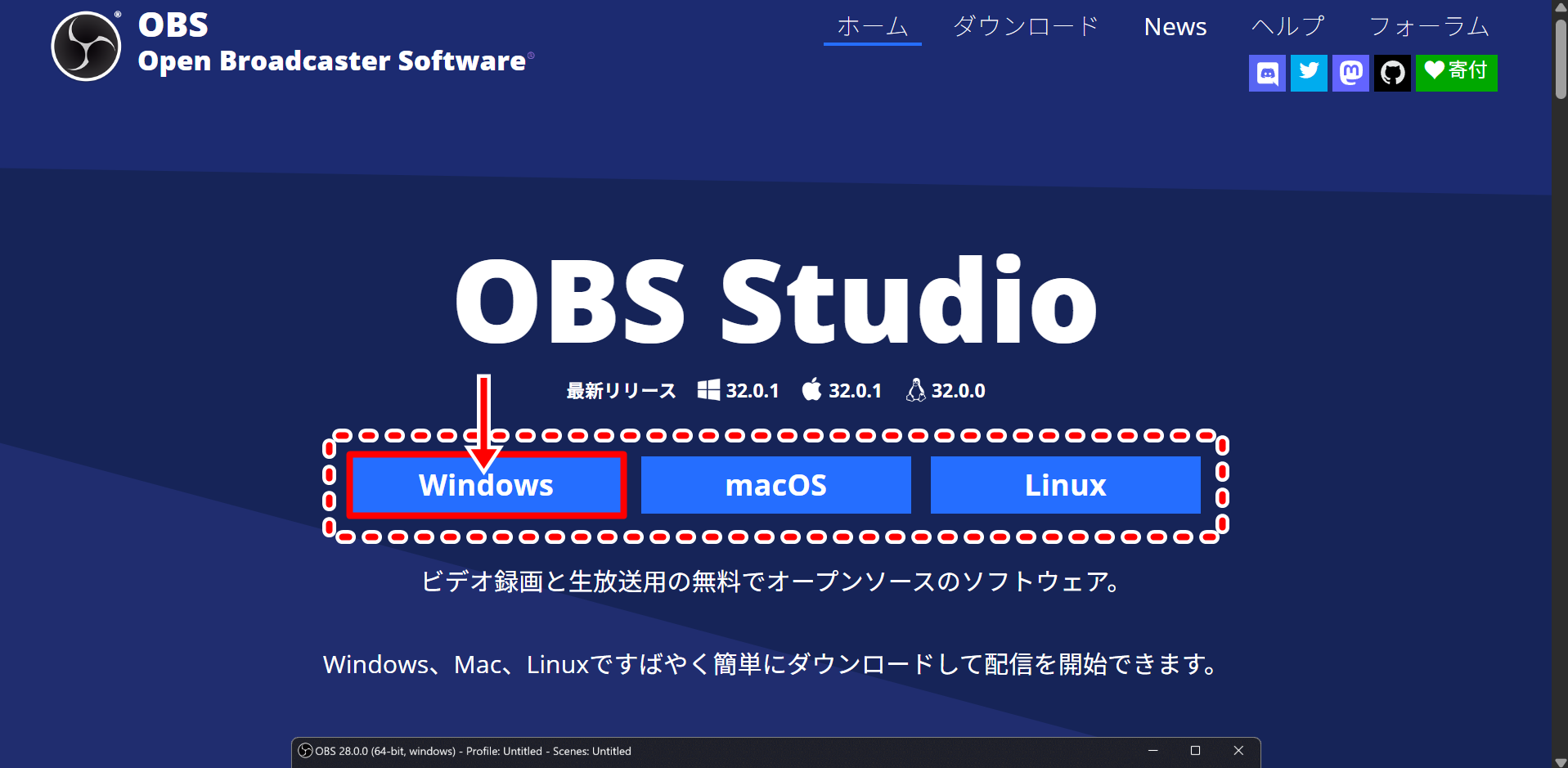 公式サイト(https://obsproject.com/ja/)にアクセスし、使用しているパソコンのオペレーティングシステムをクリックしましょう。今回は「Windows」を選択します。