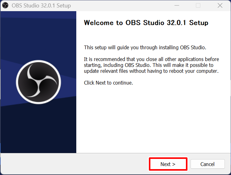 ダウンロードされたインストーラーをクリックして起動しましょう。他のアプリを開いている場合は可能な限り閉じるようにしましょう。「Next」をクリックします。