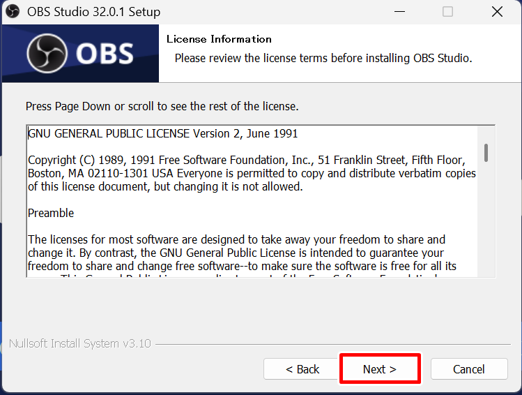 ライセンス情報が表示されます。「Next」をクリックしましょう。