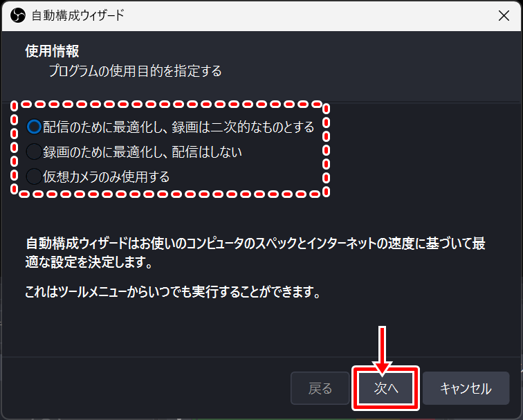 最初にOBS Studioを起動すると、自動構成ウィザードが表示されます。これは使用目的に合わせてOBS Studioの設定を自動で最適化してくれるものです。まずは目的を選択し「次へ」をクリックしましょう。