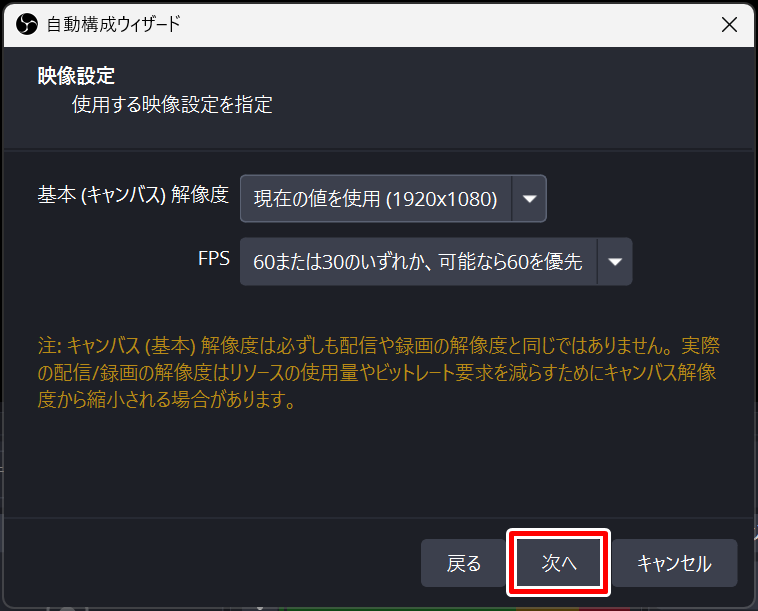次に映像設定の指定画面になります。とくにこだわりがなければ変更せず「次へ」をクリックしましょう。