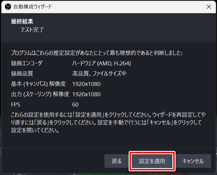 自動でテストされ、使用しているパソコンで最適な設定が表示されます。問題がなければ「設定を適用」をクリックしましょう。