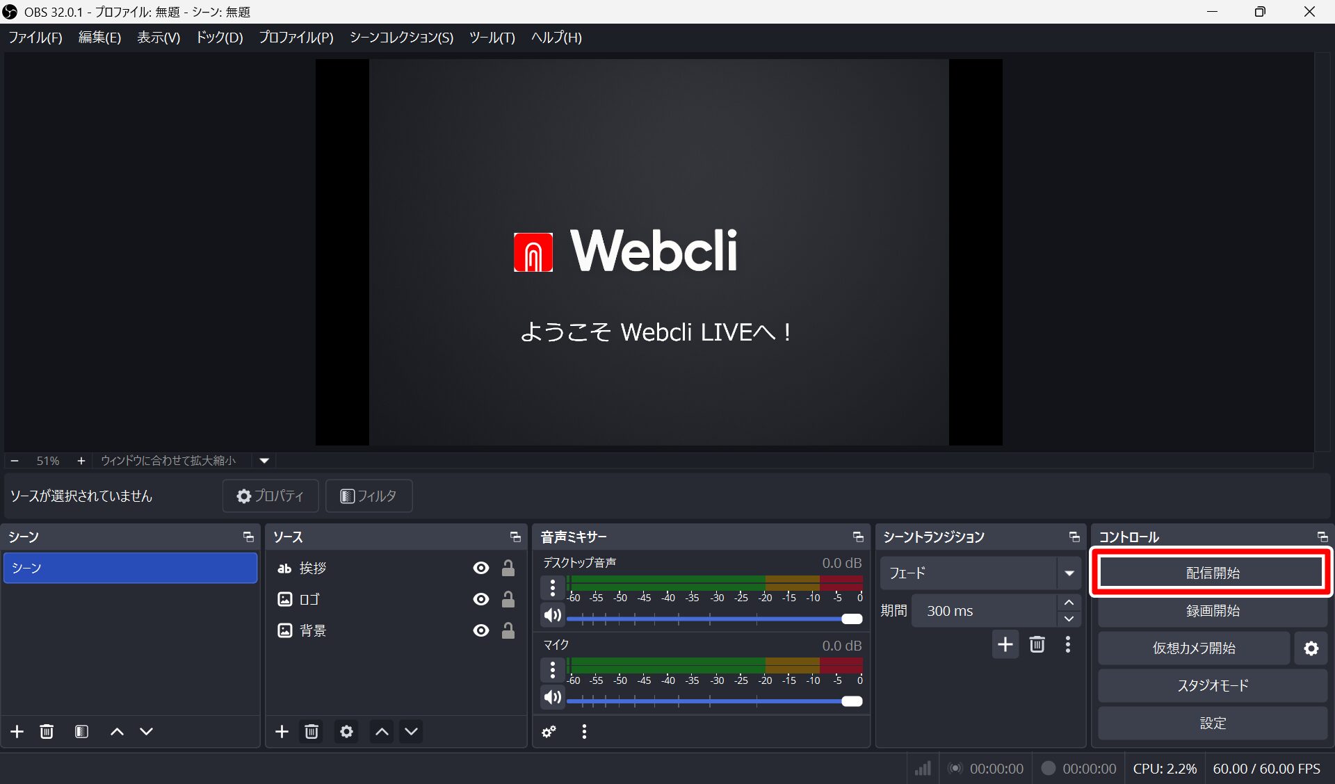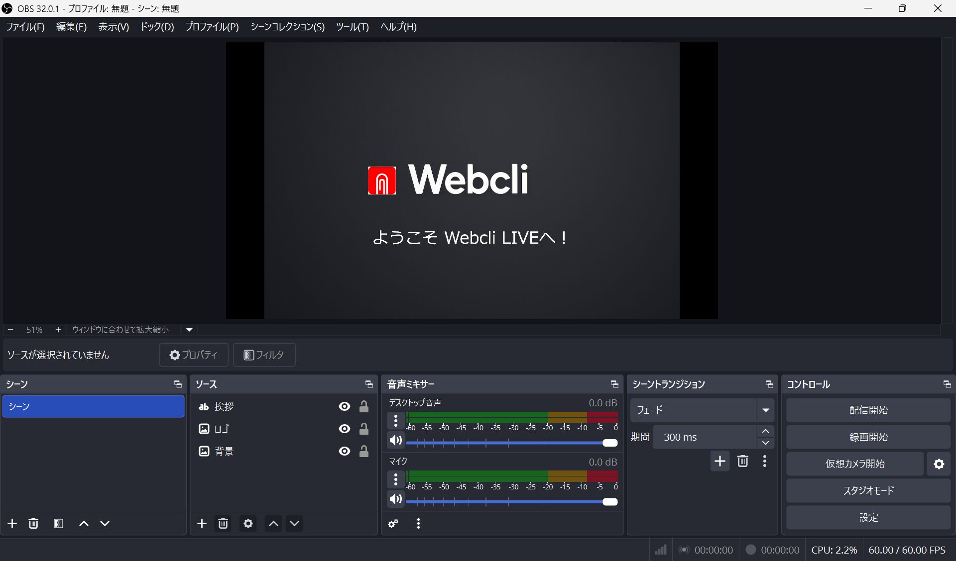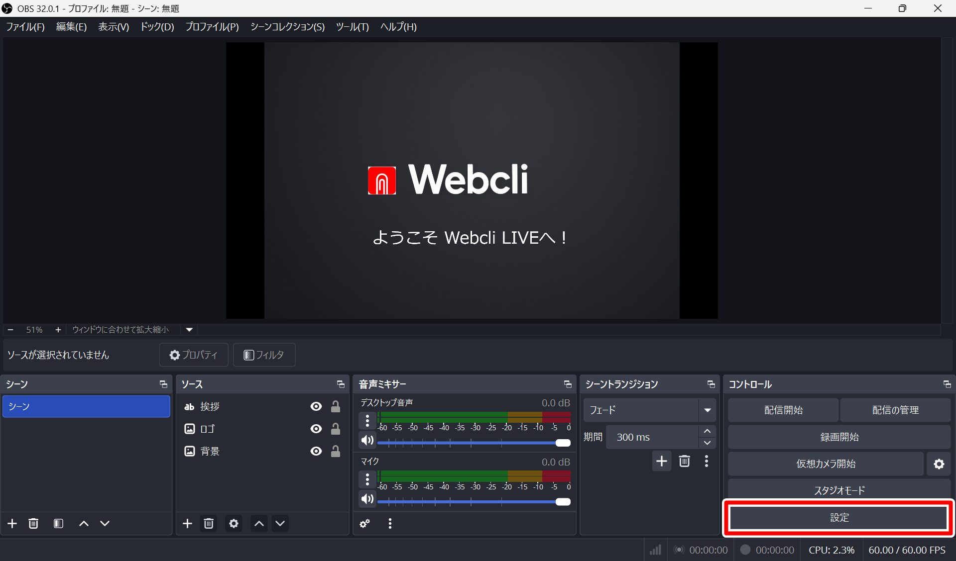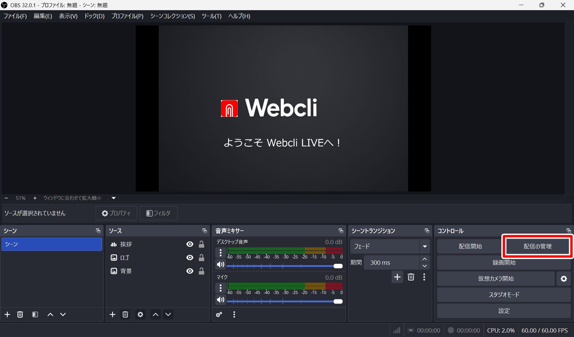 配信中や録画中に画面を編集をしてシーン切り替えとして映し出す事ができます切り替えることができます。 - 設定: