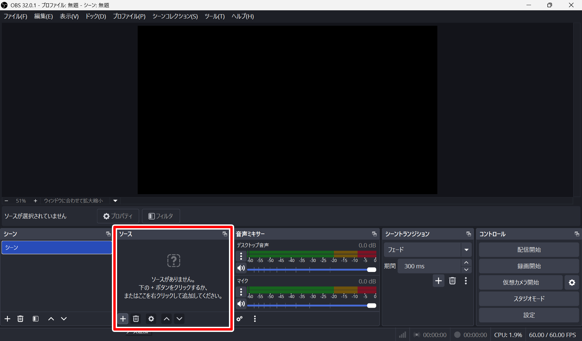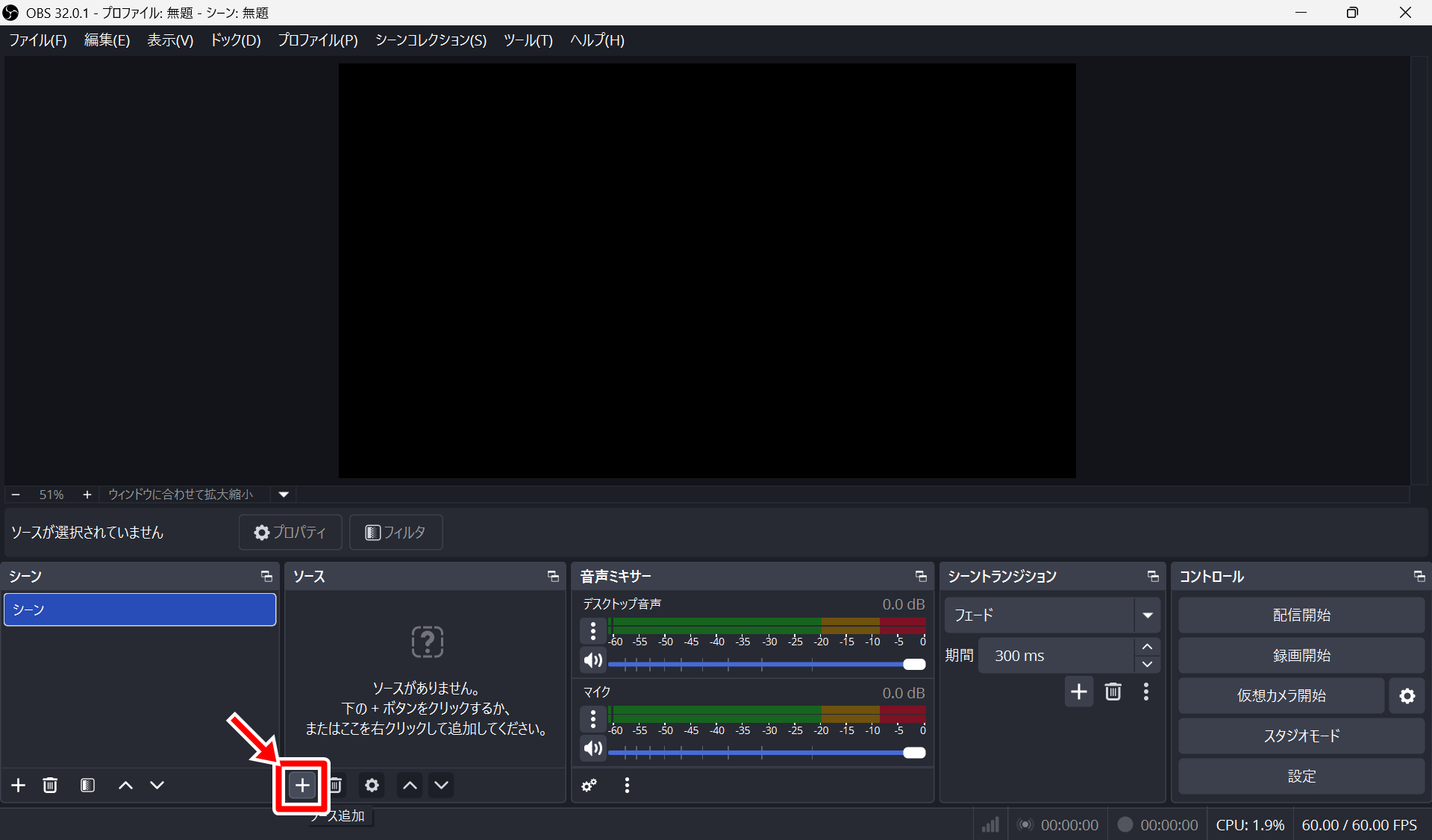 配信画面を作成します。まずは配信に画像を映してみましょう。「ソース」の下の「+(プラス)」をクリックしましょう。