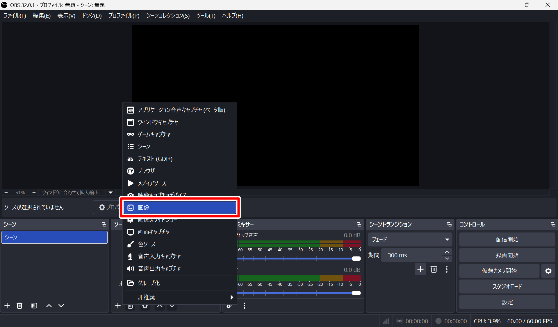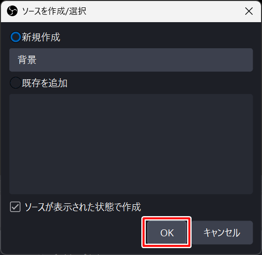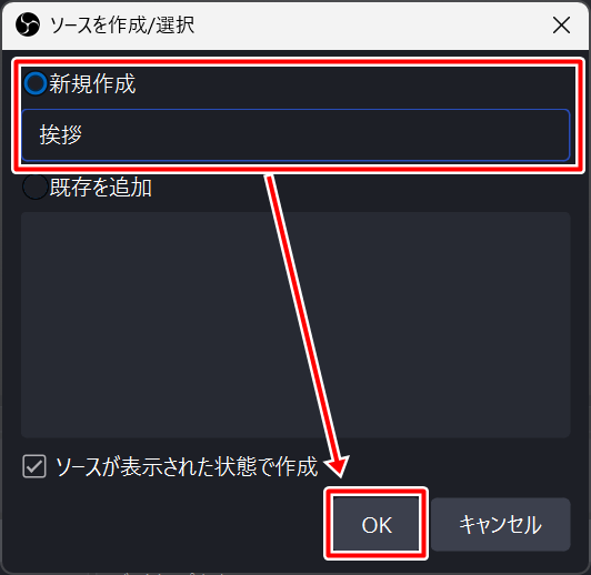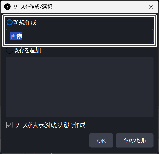 ソースの名前を設定します。新規作成で任意の名前を入力しましょう。
