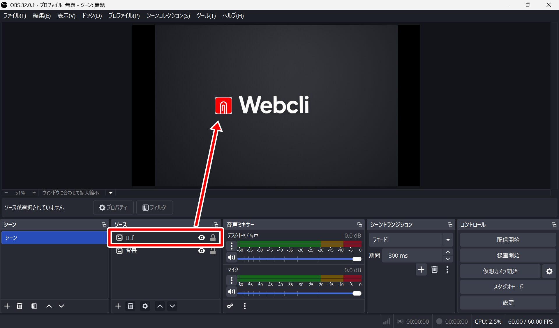 ソースとは配信画面を構成する個々の要素のことです。ゲーム画面やウインドウ、画像、動画、テキスト、カメラ映像などさまざまな要素を追加して配信画面をデザインできます。