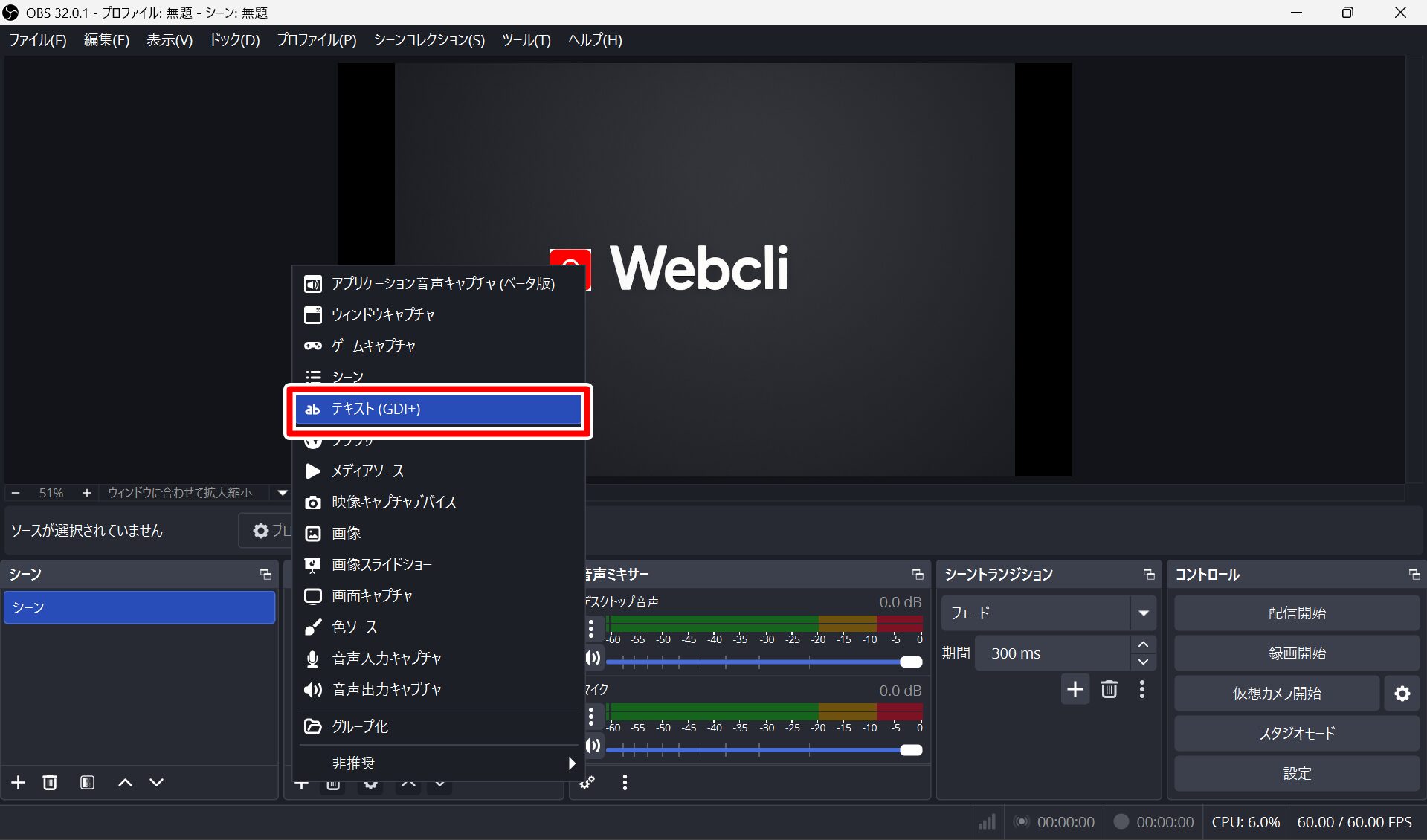 次はテキストを映してみましょう。同じく「ソース」の「+(プラス)」を選択し、メニューの中から「テキスト」をクリックしてください。