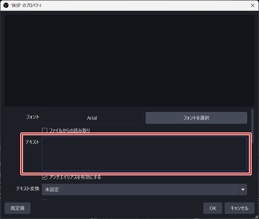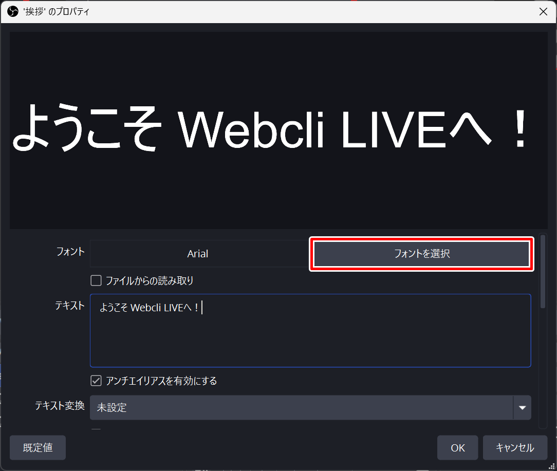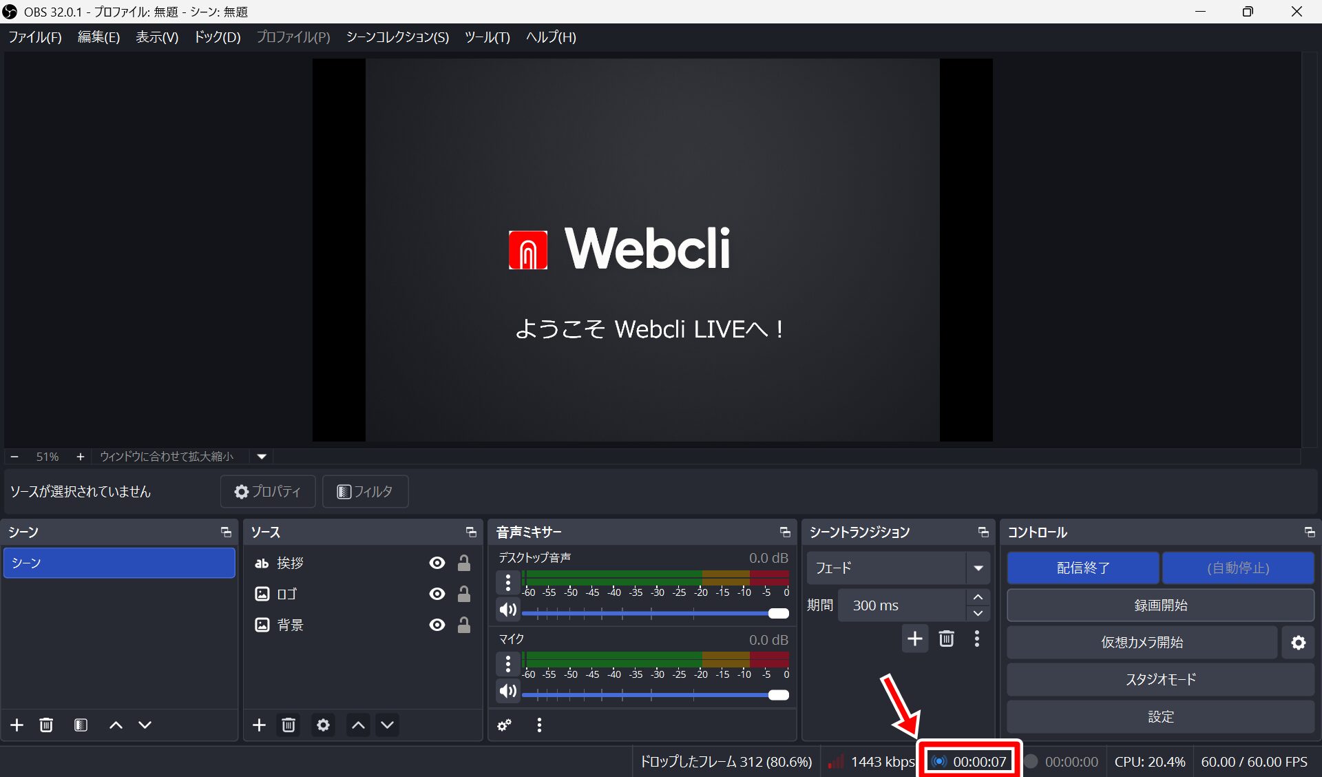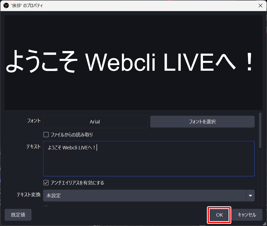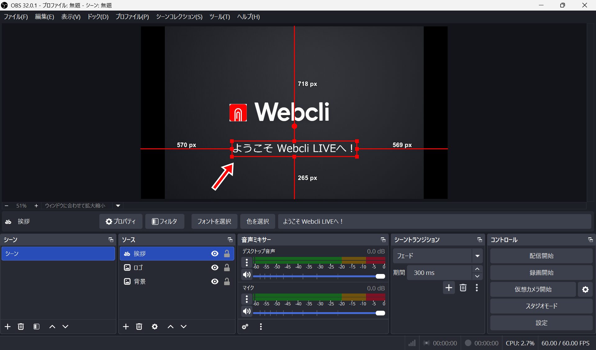 配信画面にテキストが表示されました。テキストも同様に自由に位置を動かすことができます。