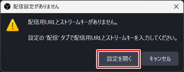 初めて配信するときは設定が未完了であるため「設定を開く」をクリックし配信設定を行います。