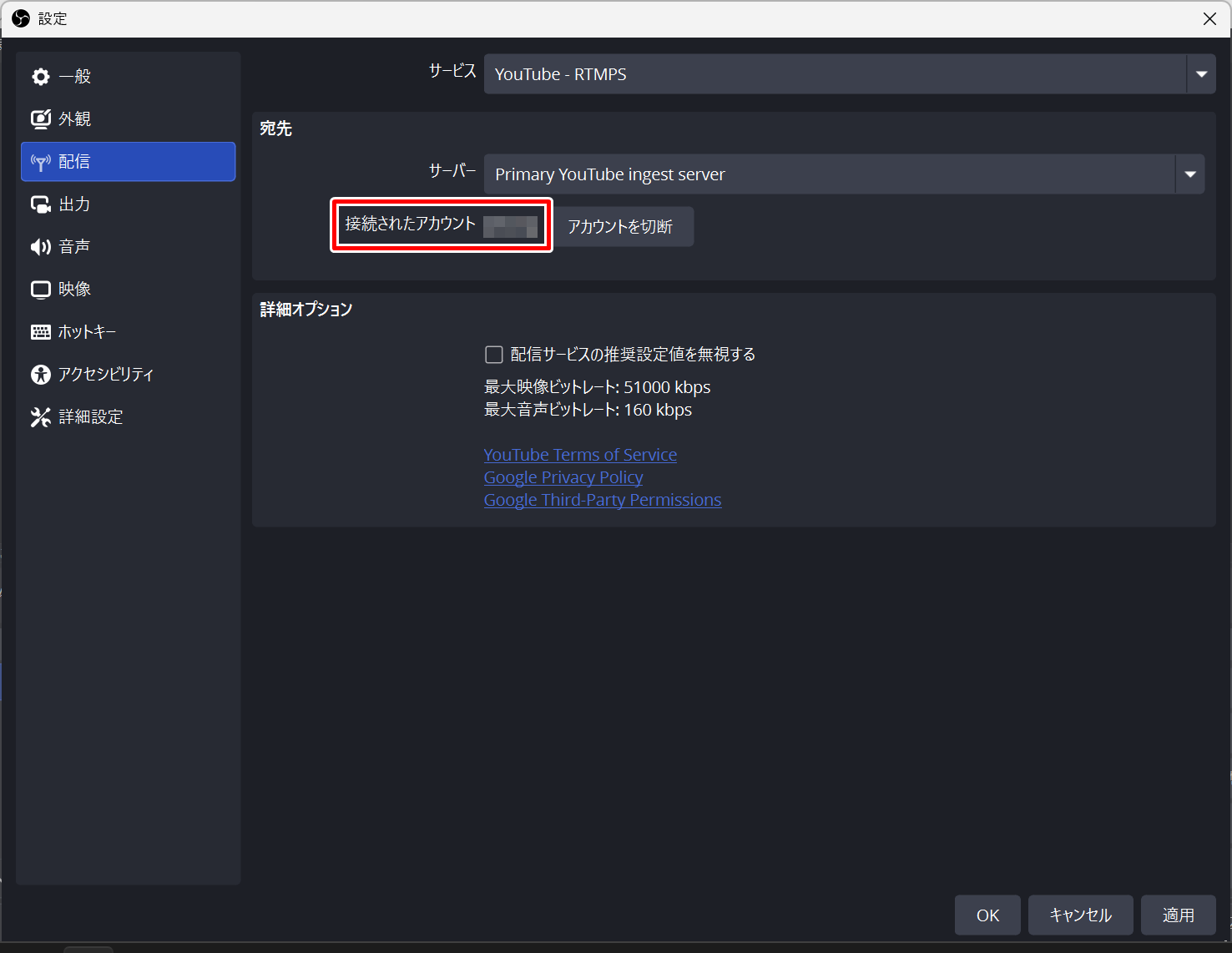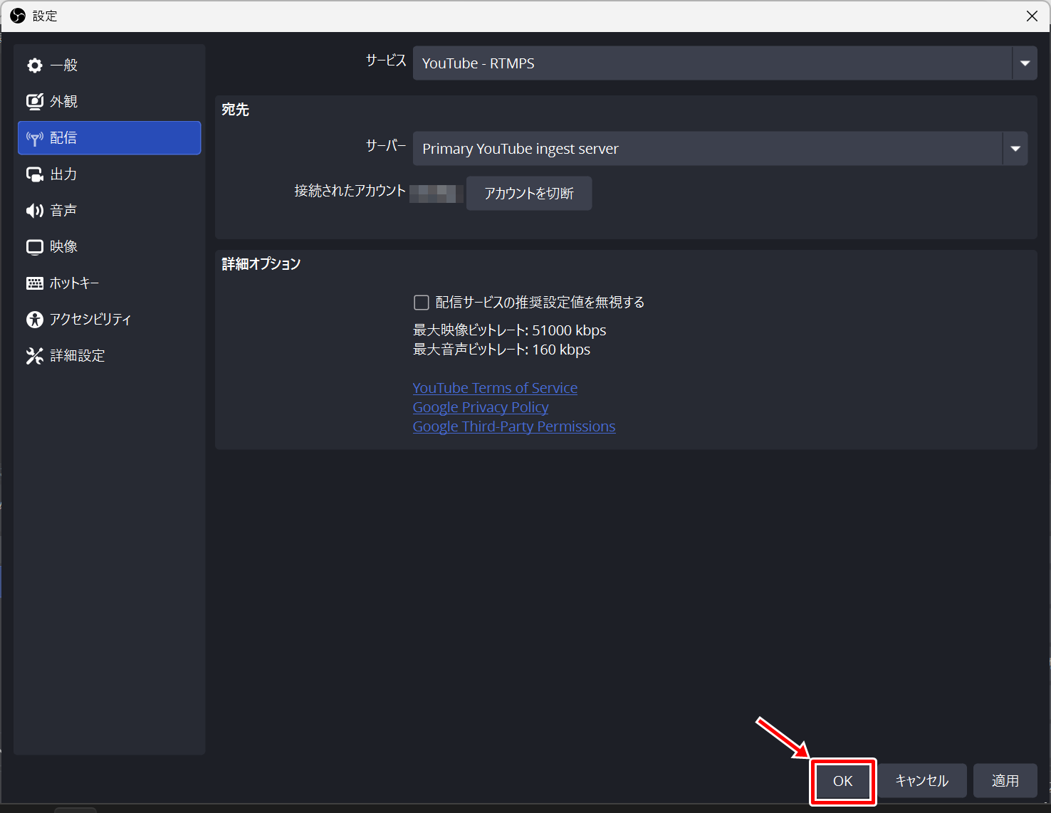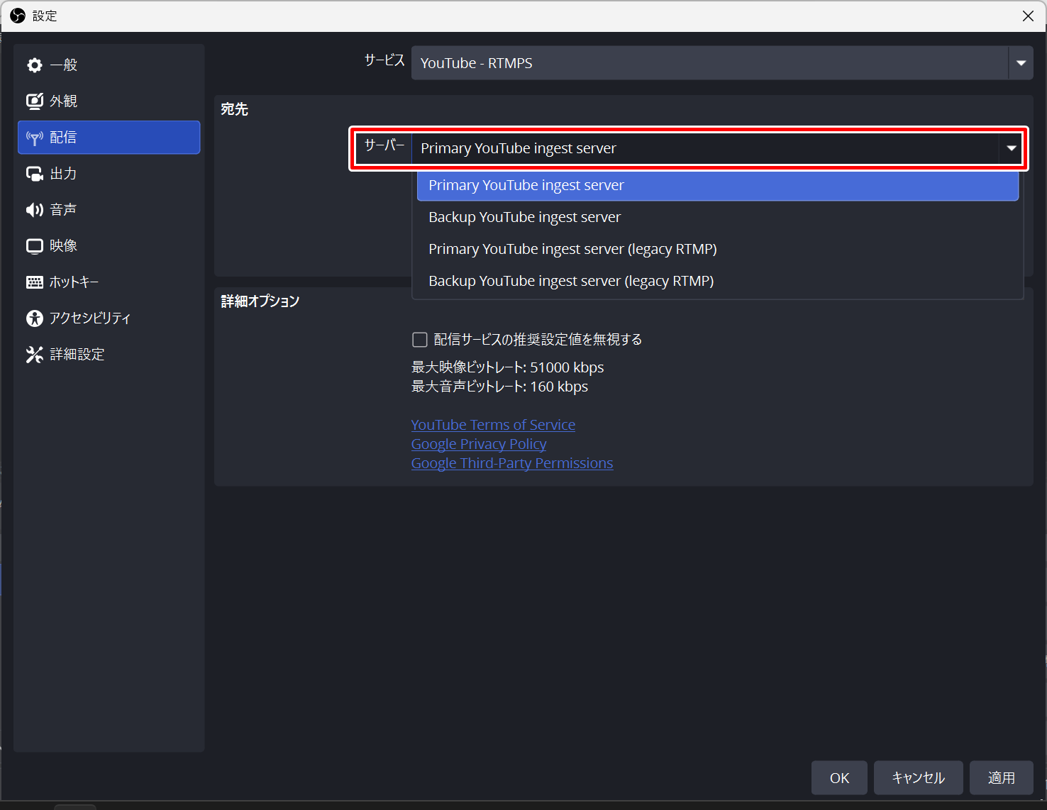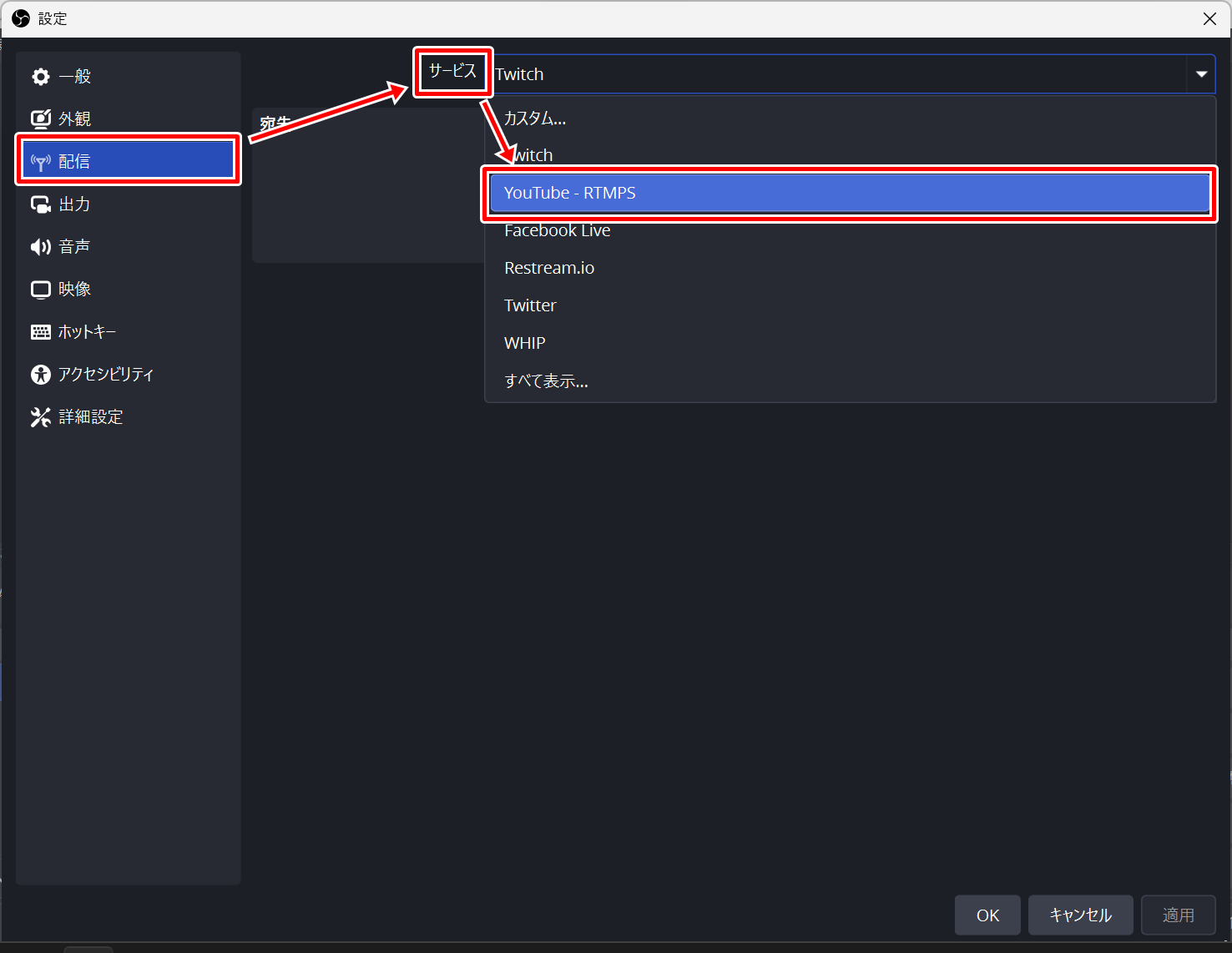 設定画面より、「配信」の「サービス」を「YouTube-RTMPS」に変更しましょう。