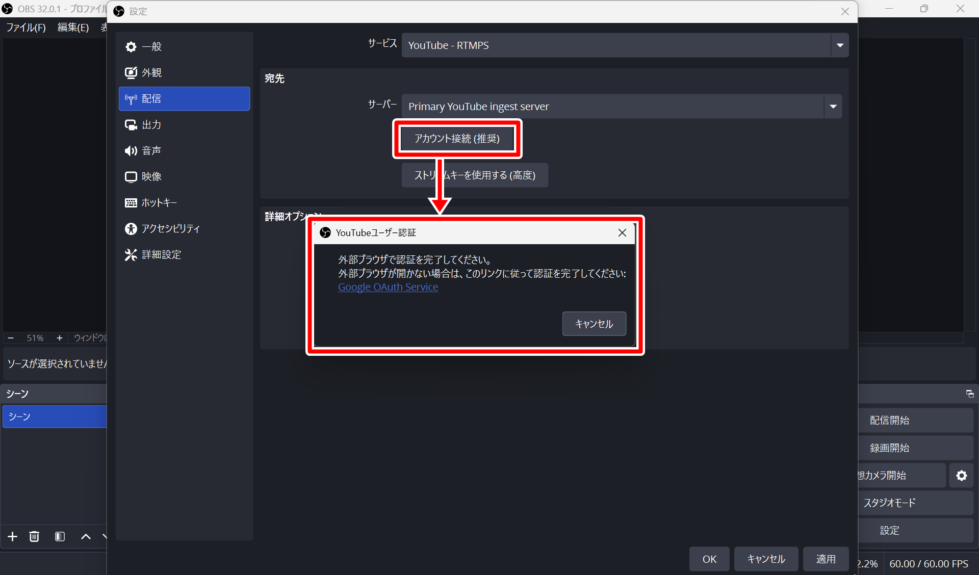 「アカウント接続」をクリックしYouTubeアカウントと連携します。外部ブラウザが自動で開きます。