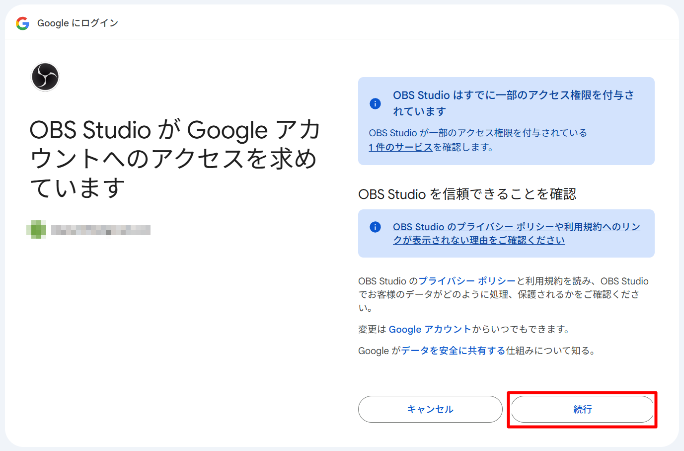 YouTubeへのアクセス許可の確認が表示されます。問題なければ「続行」をクリックしましょう。