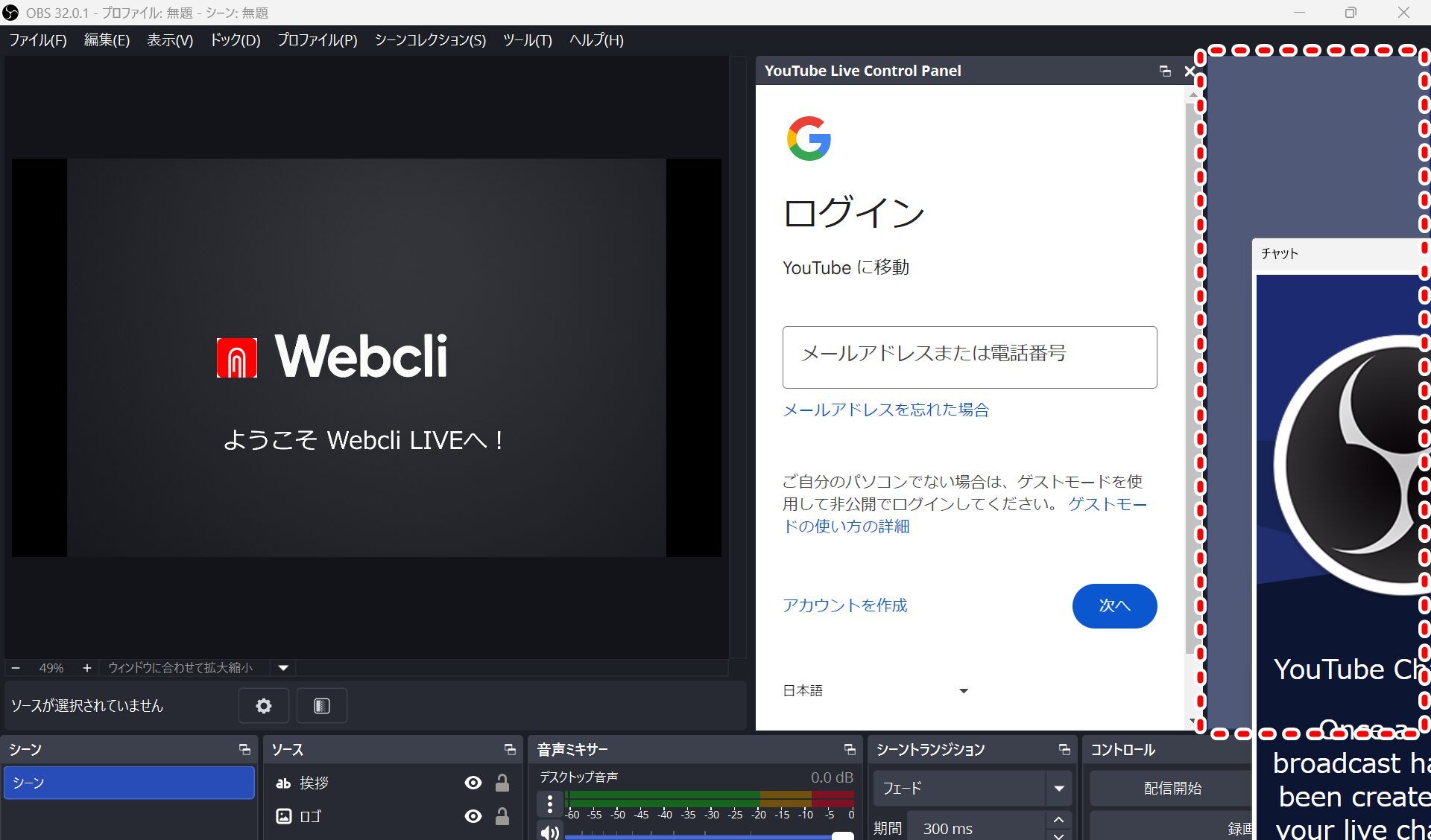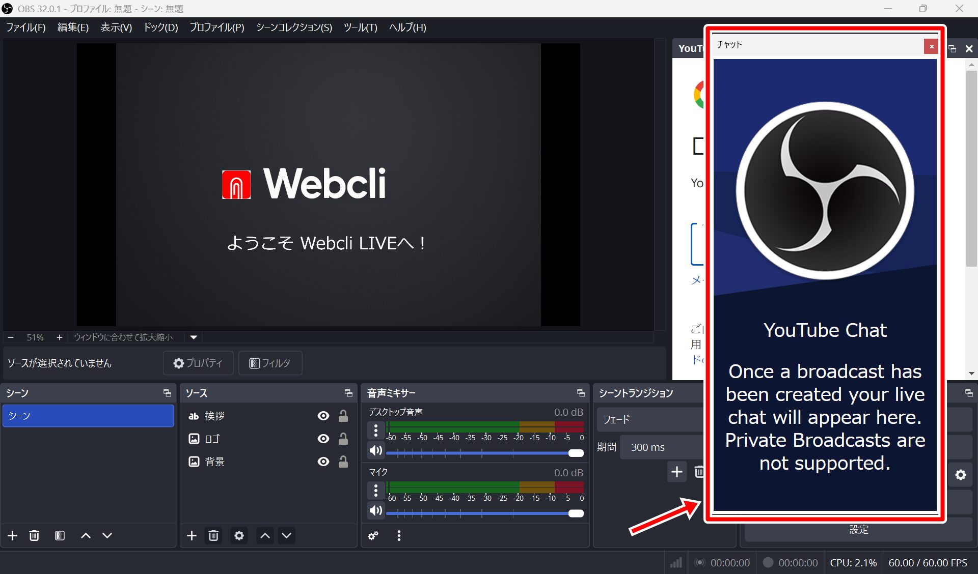 YouTubeと連携したため、「チャットウィンドウ」が表示されます。ここでYouTube Live中のチャット欄を確認できるようになります。配信画面には表示されません。配信しながら視聴者のコメントをリアルタイムで見たいときに役立ちます。