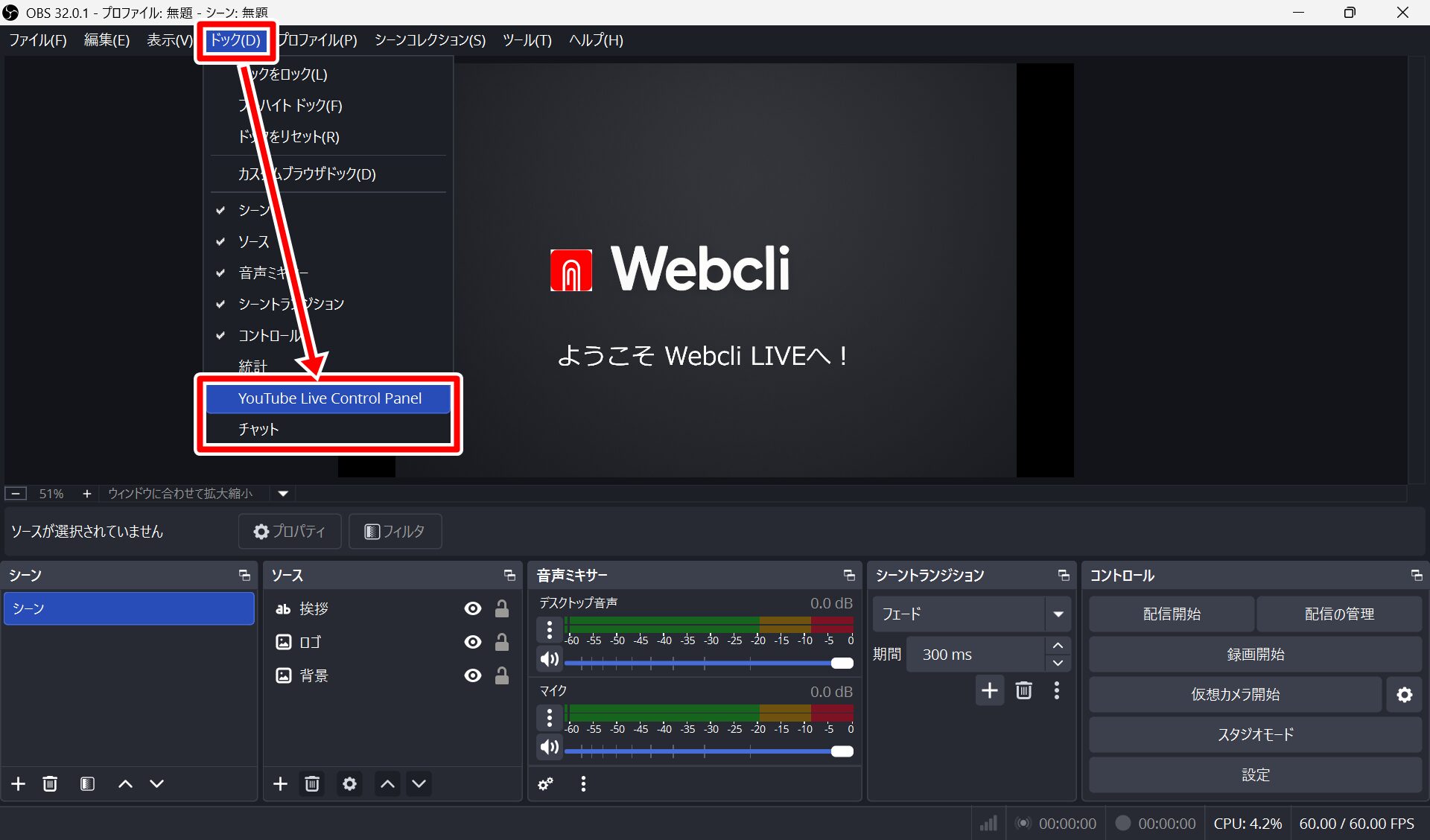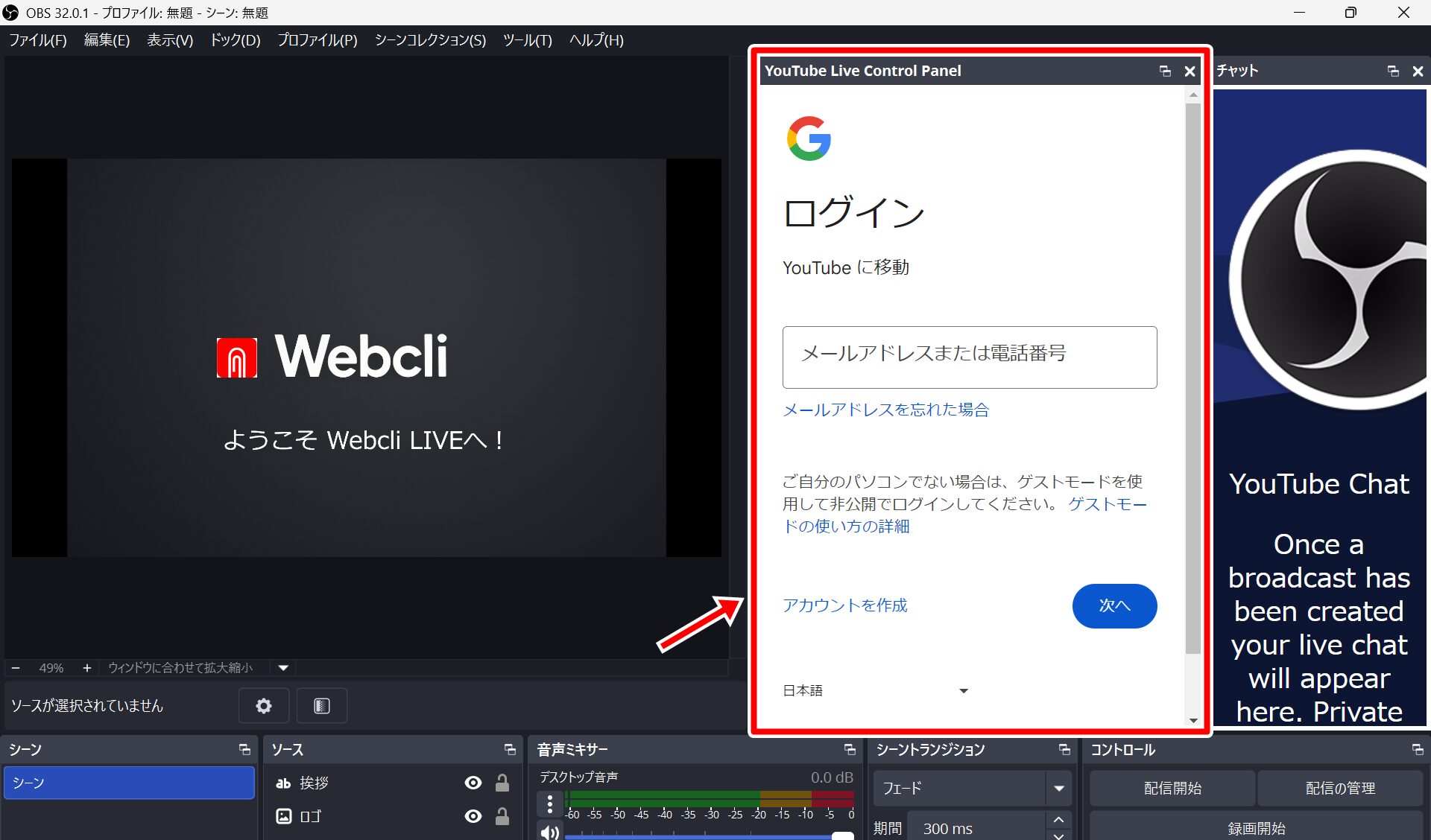 同じく「YouTube Live Control Panel」も表示されます。ライブ配信中の各種データ(同時視聴者数や総視聴回数)をリアルタイムで把握できる機能です。YouTube Studio を別タブで開かなくてもOBSの画面上で情報を確認しながら配信できます。