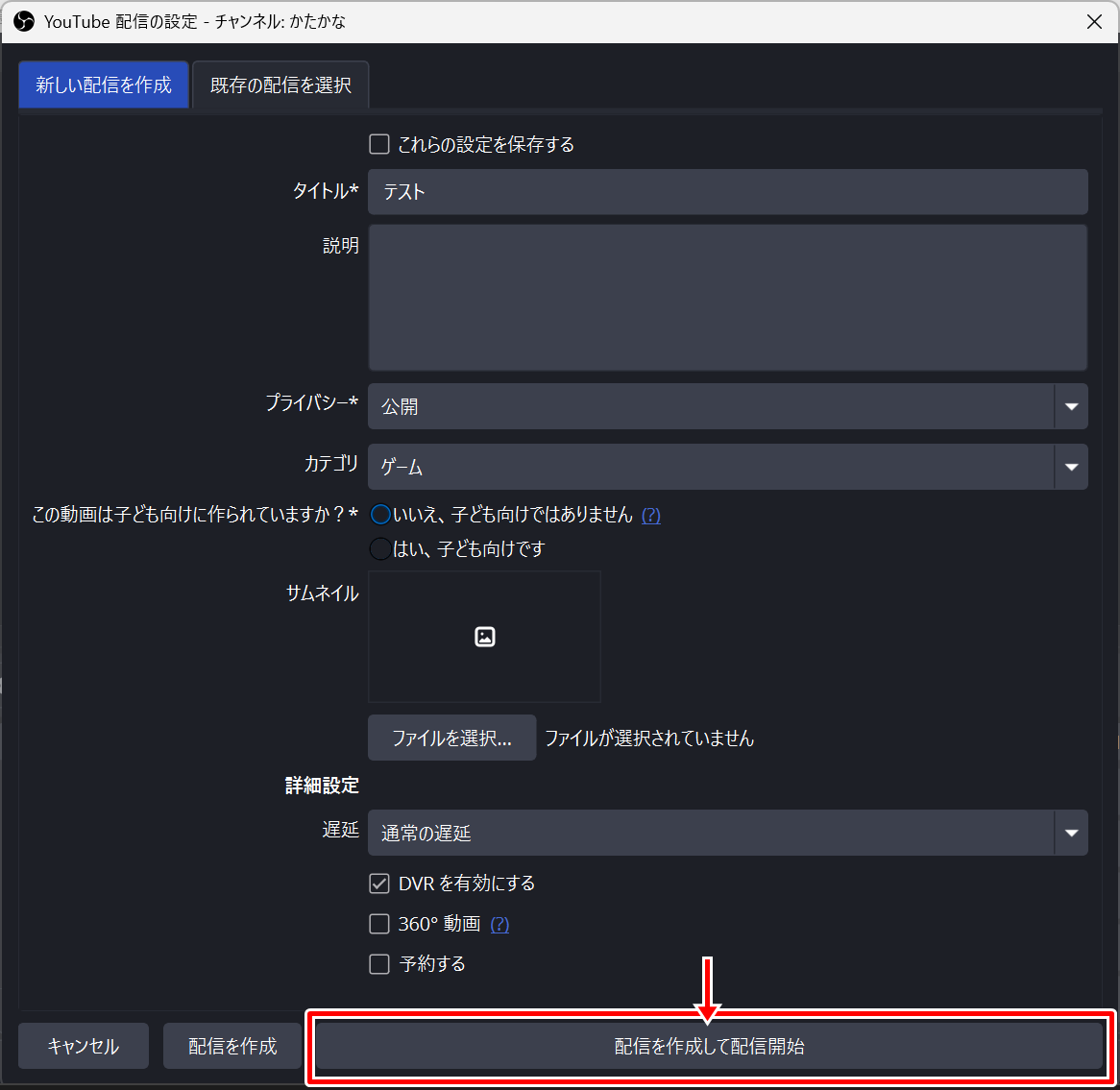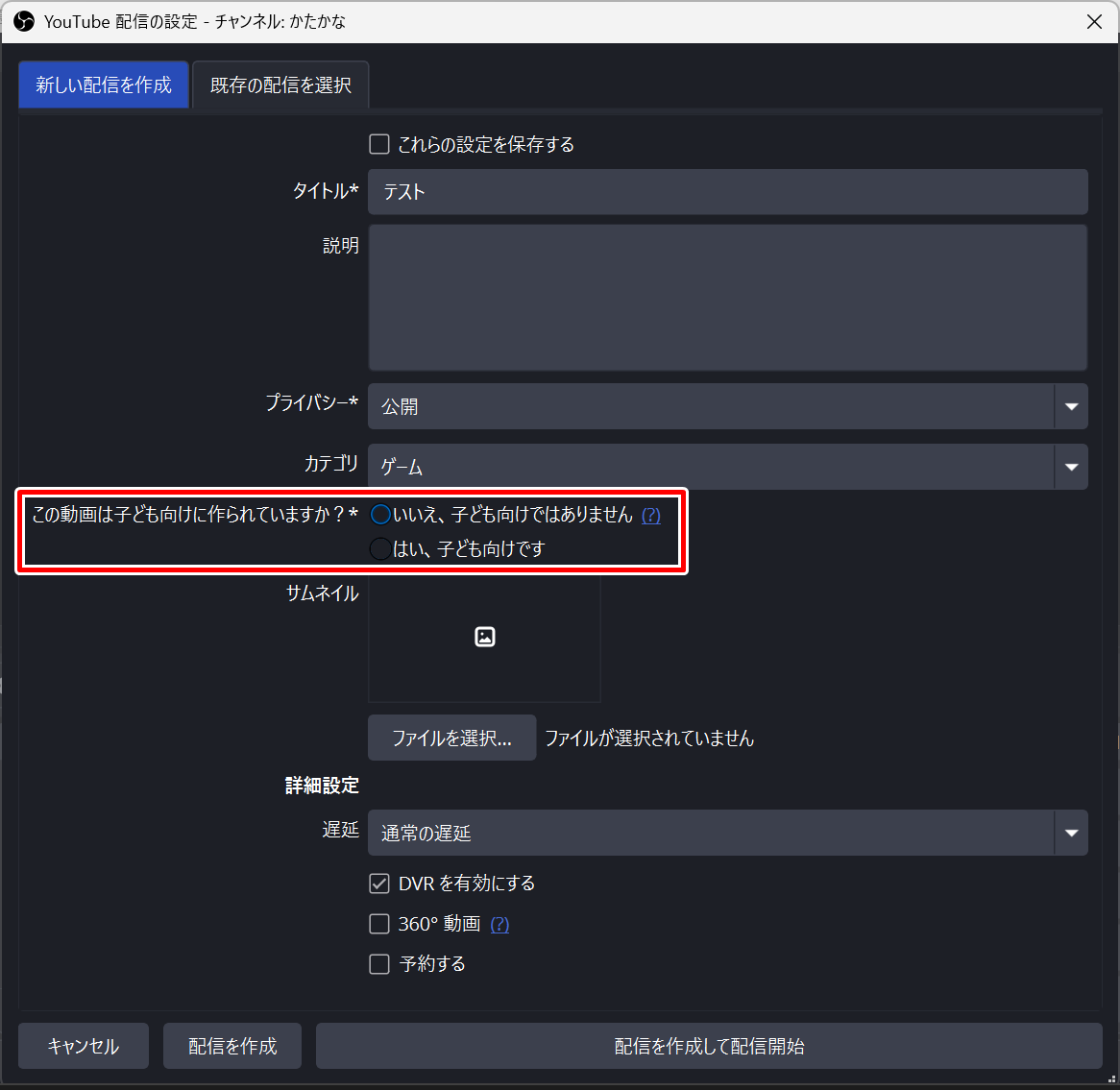 配信(動画)が子ども向けかどうかを選択しましょう。