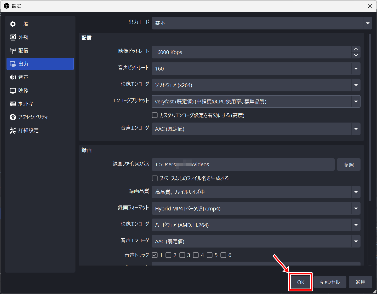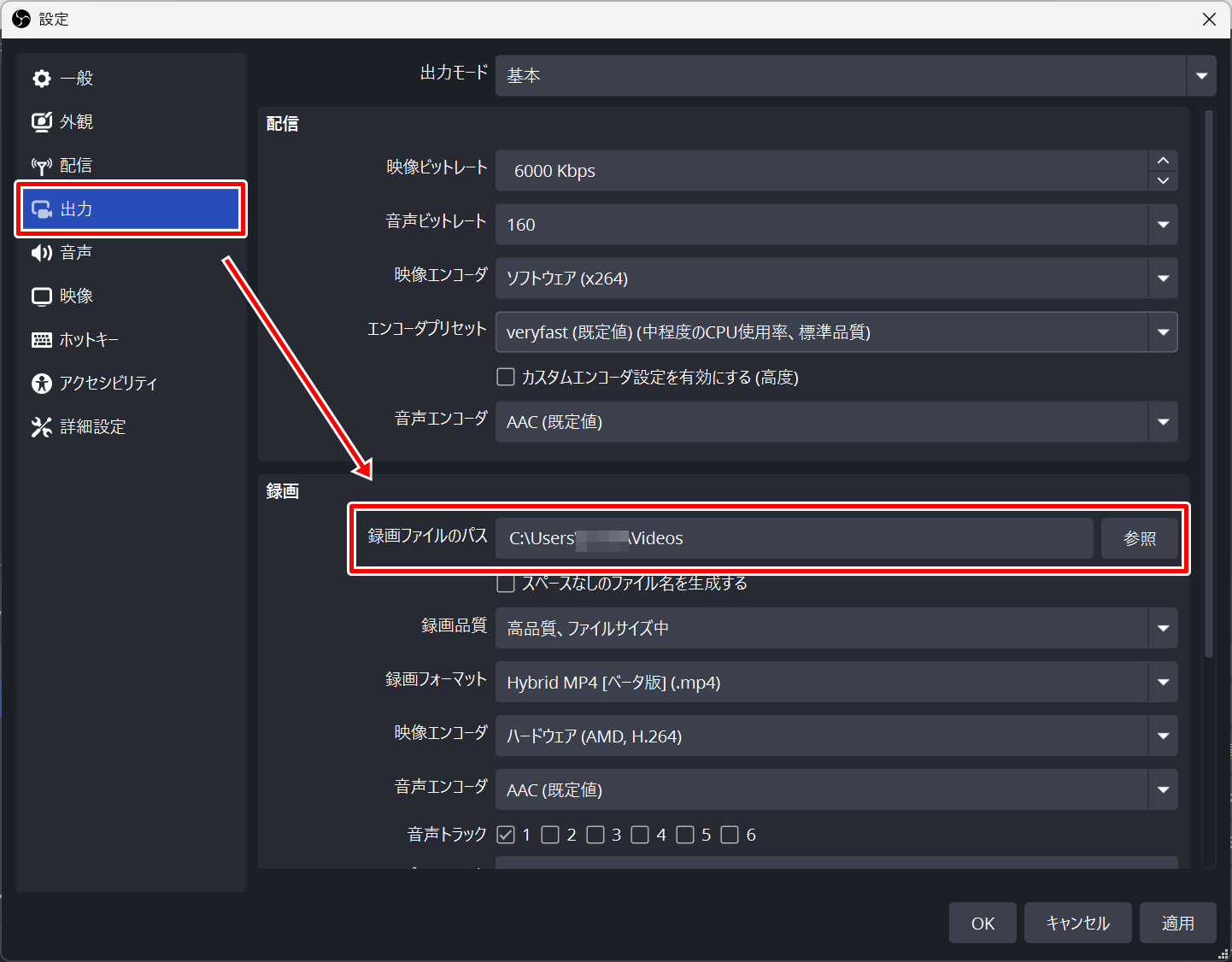 設定画面の「出力」から録画メニューにある「録画ファイルのパス」を確認しましょう。ここが録画した動画の保存先となります。必要に応じて「参照」をクリックし保存先を指定しましょう。