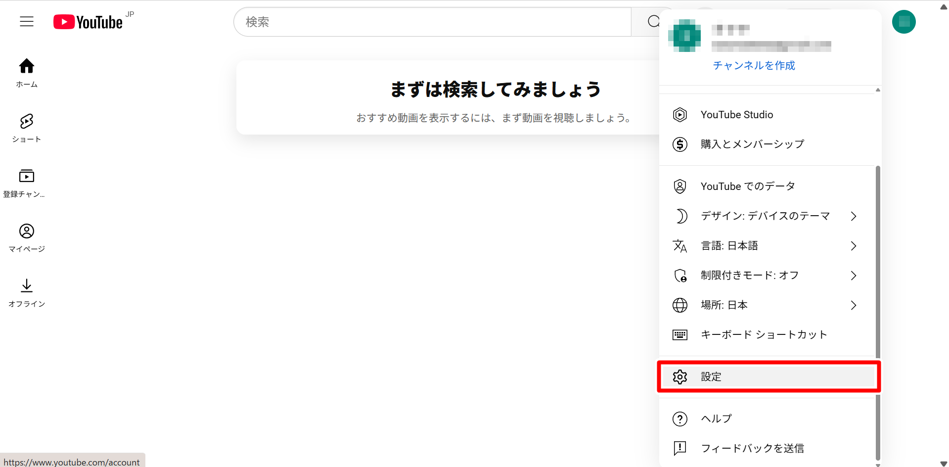 再びYouTube画面が表示されるので、もう一度アイコンメニューの「設定」をクリックしましょう。