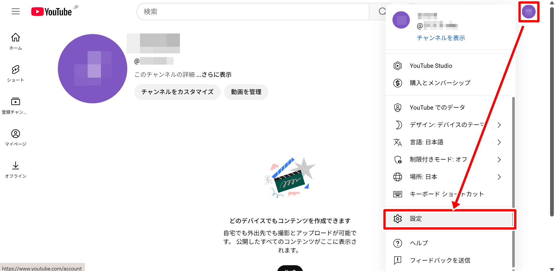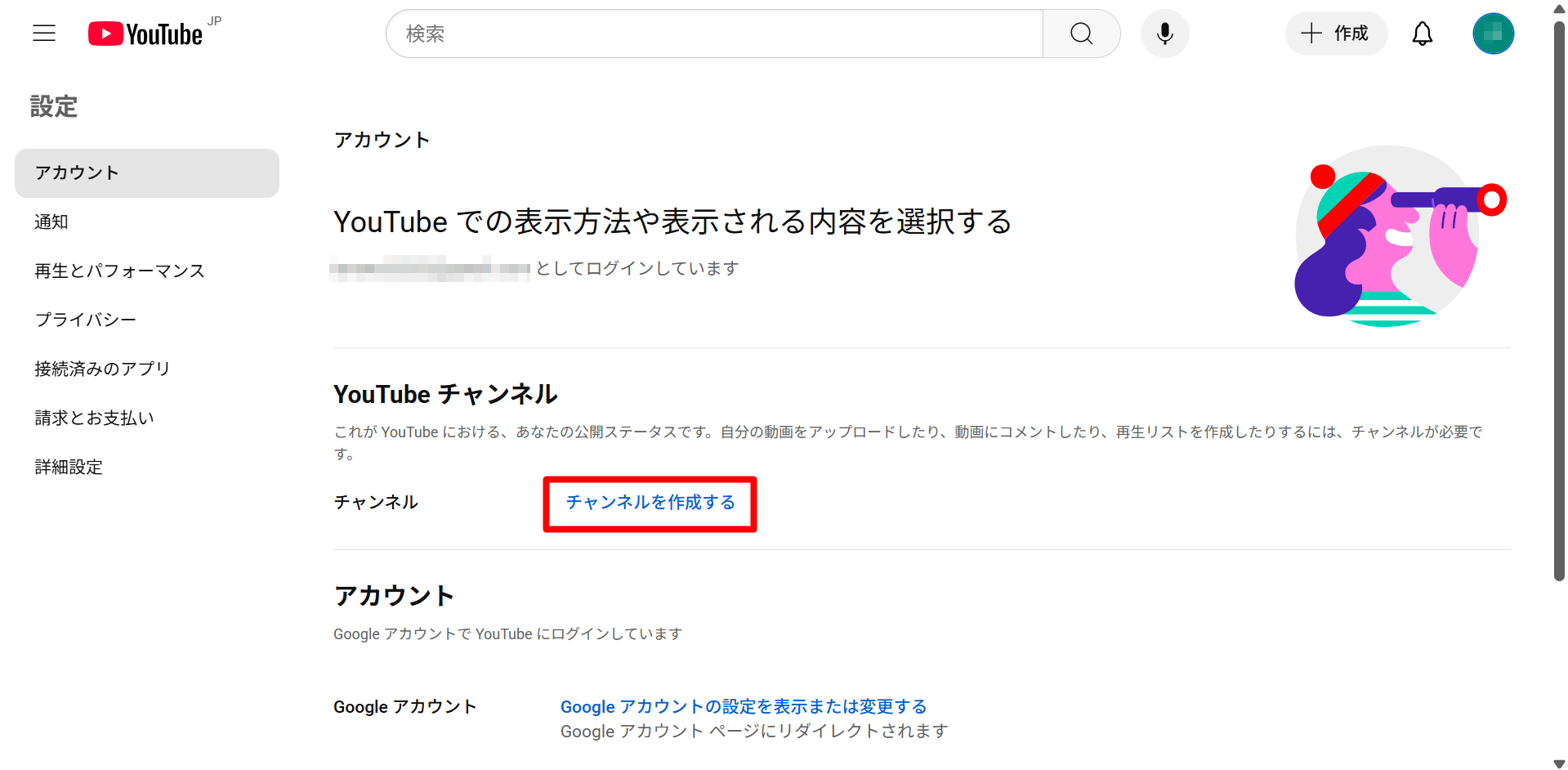 アカウント設定が表示されます。「チャンネルを作成する」をクリックします。※チャンネルが既に作成されている場合はこの操作は不要です。
