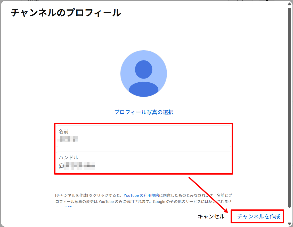 チャンネルのプロフィールを設定します。「名前」と「ハンドル」が自動で設定されています。必要に応じて変更し、問題なければ「チャンネルを作成」をクリックしましょう。