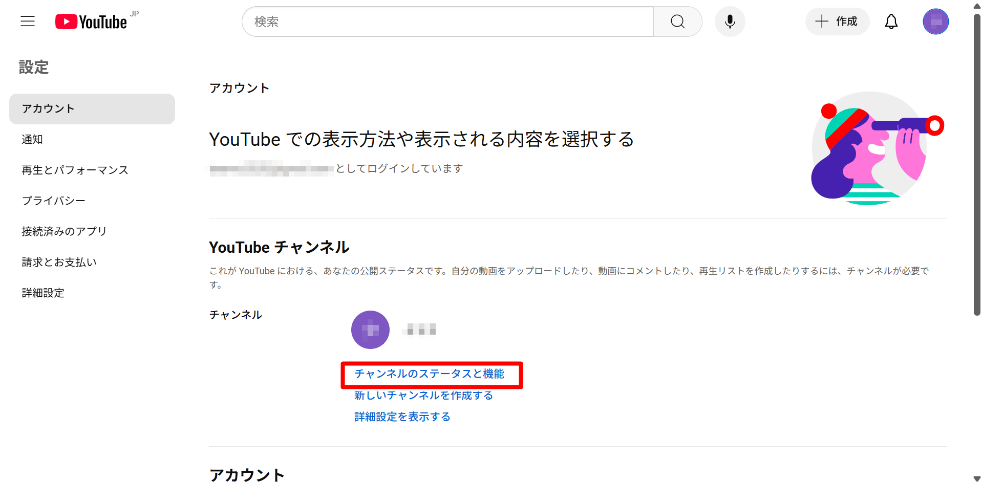 アカウント設定の「チャンネルのステータスと機能」をクリックしましょう。