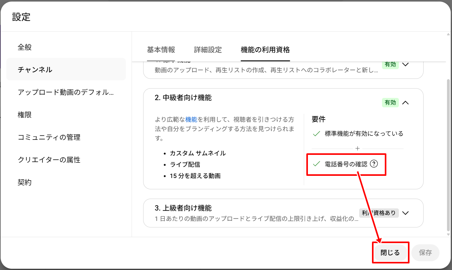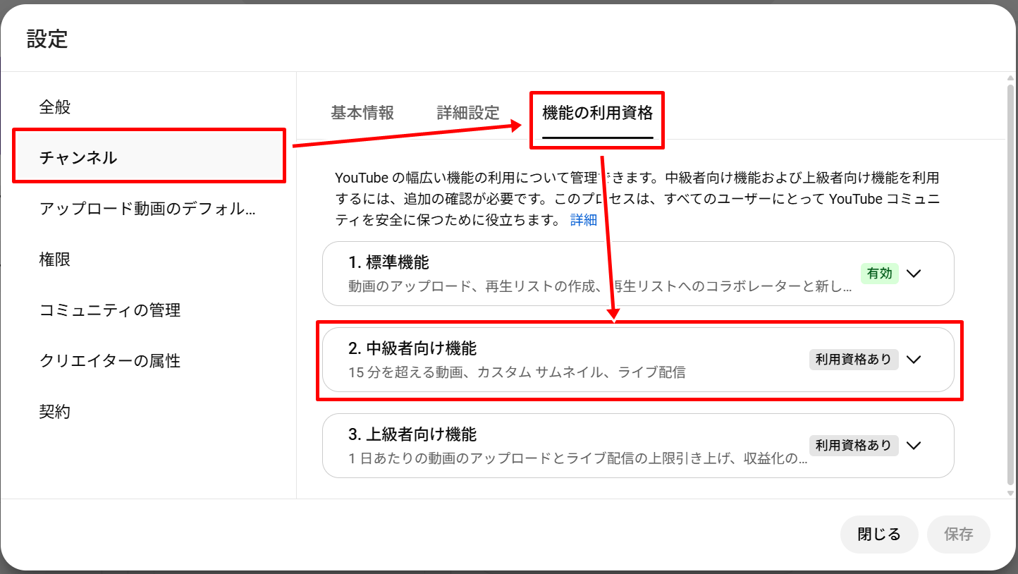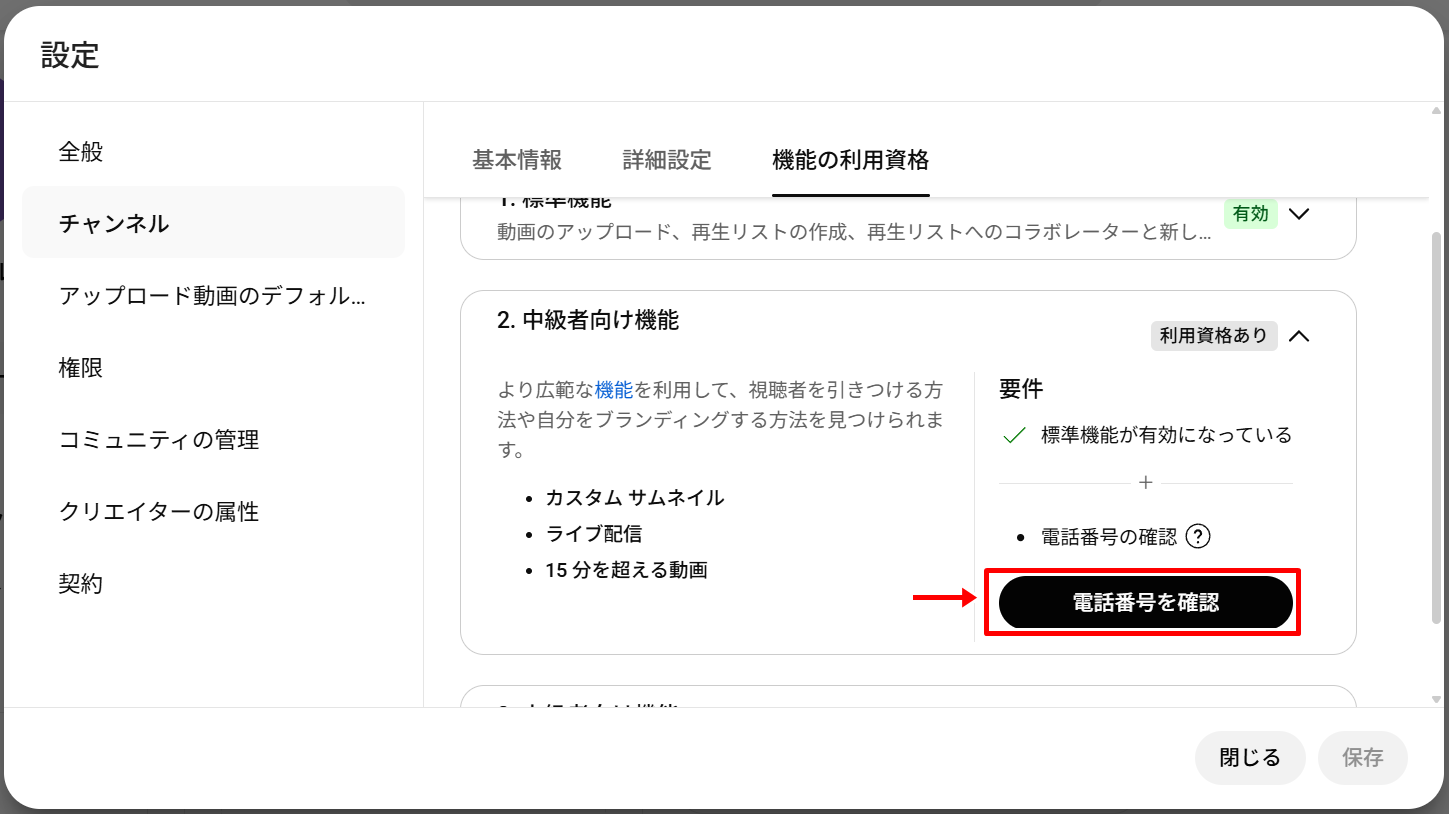 チャンネルのステータス画面が表示されるので、「機能の利用資格」にある「2.中級者向け機能を」をクリックします。