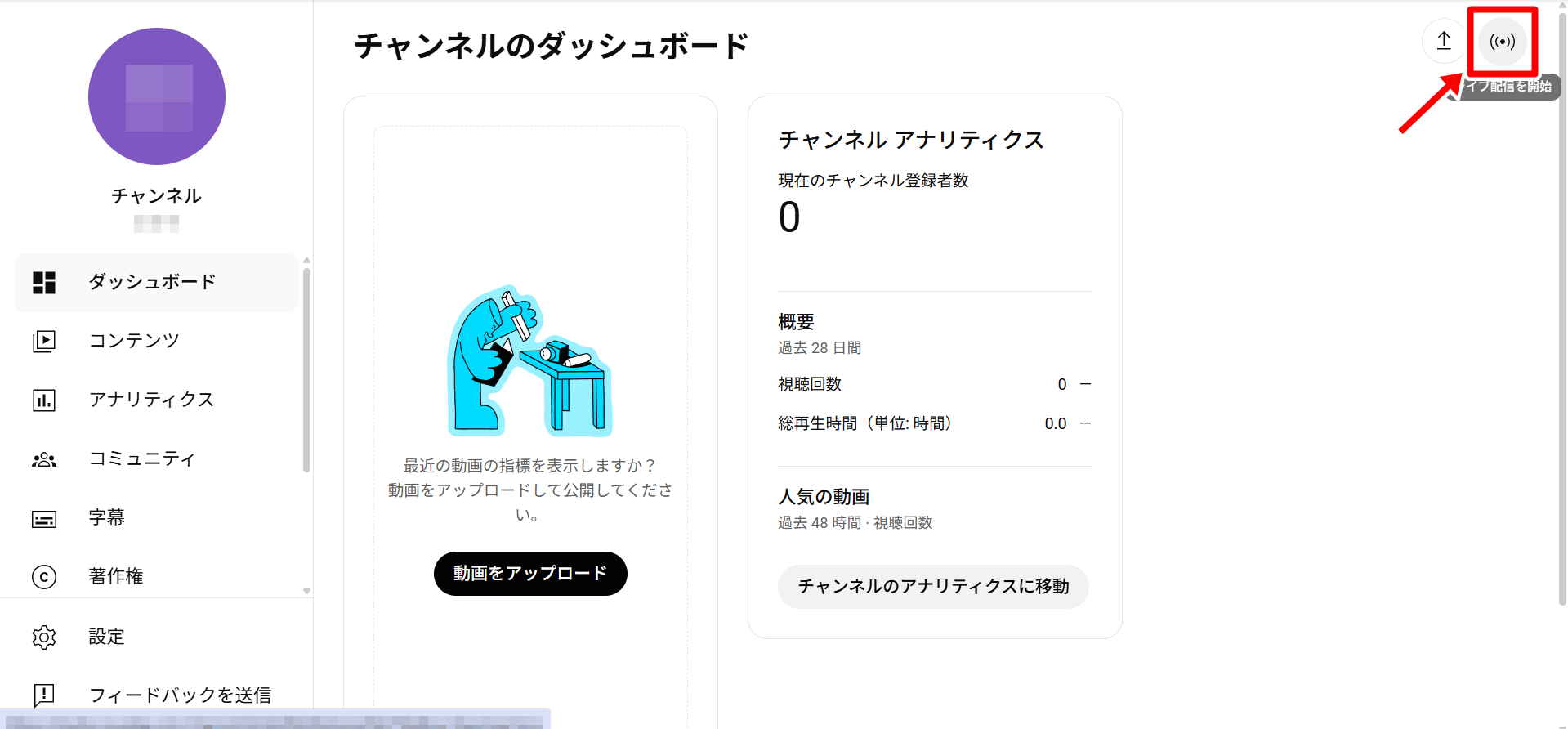 チャンネルの画面に映ります。右上の「ライブ配信の開始」をクリックしましょう。
