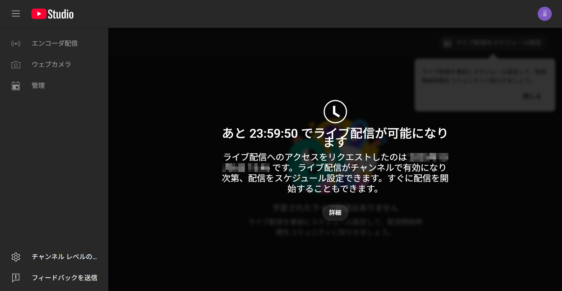 ライブ配信が可能になる時間が表示されます。電話番号を登録してから24時間後にライブ配信可能となります。