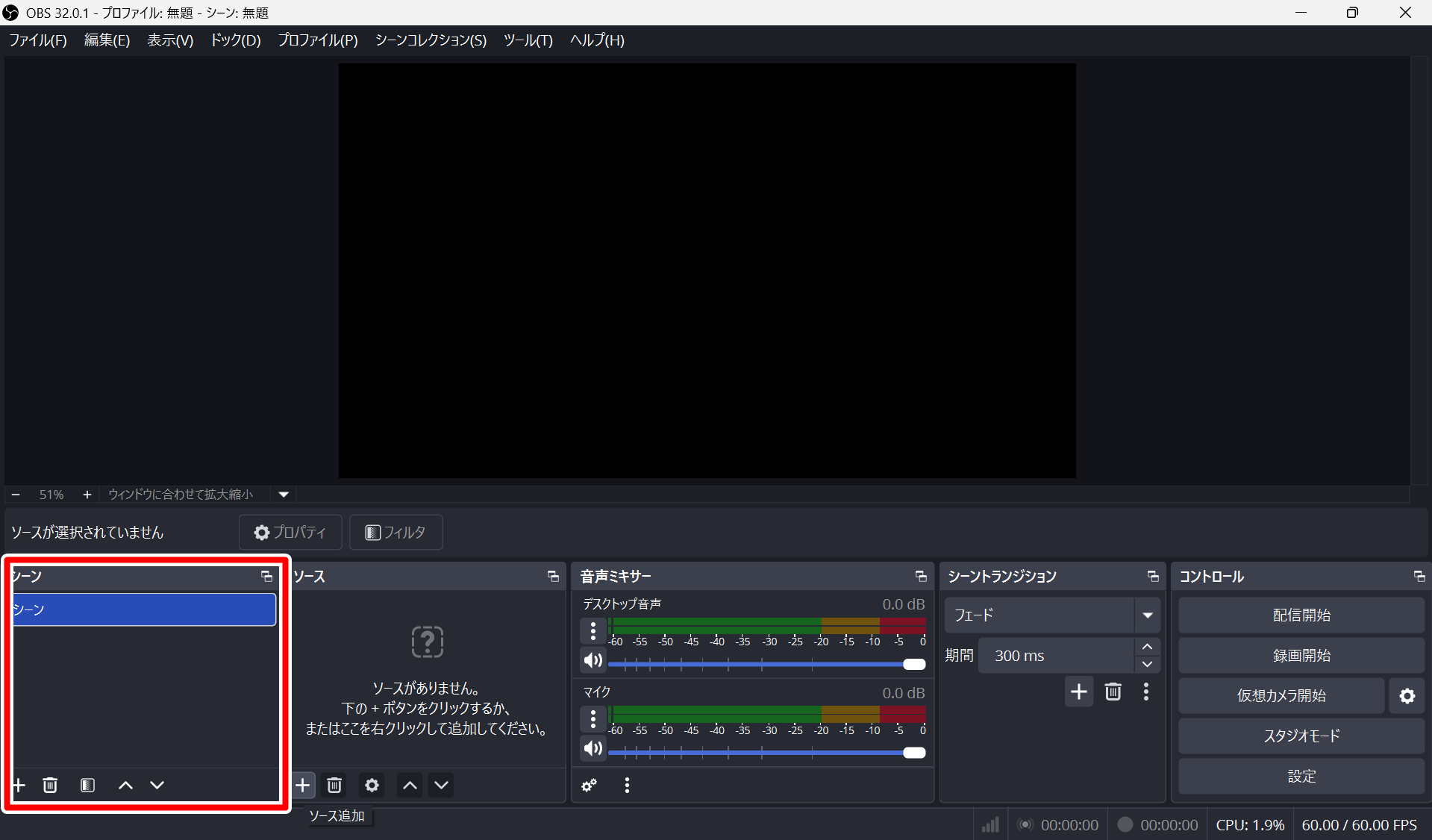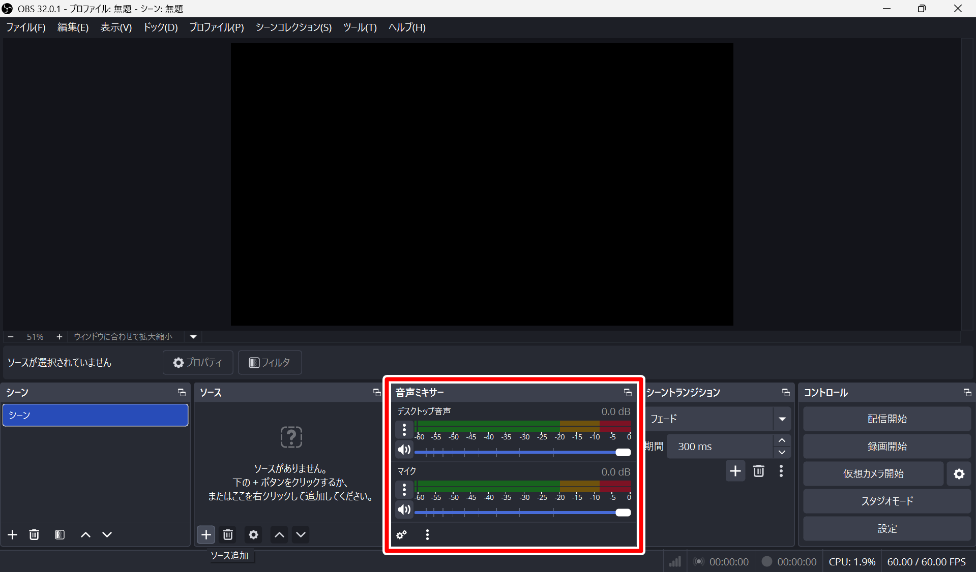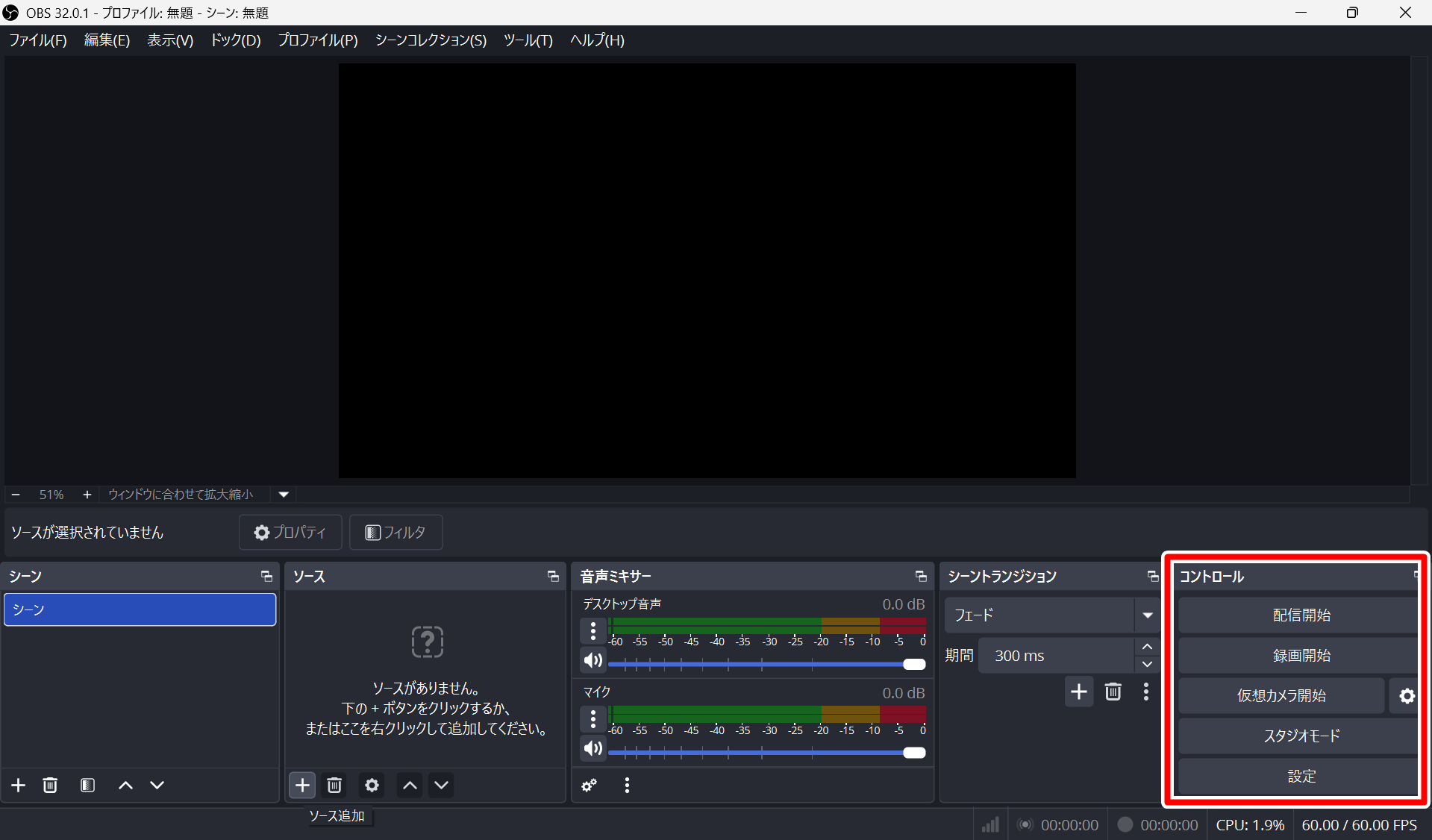コントロールは配信や録画の開始・停止、シーン切り替え、全体の設定を行う機能です。