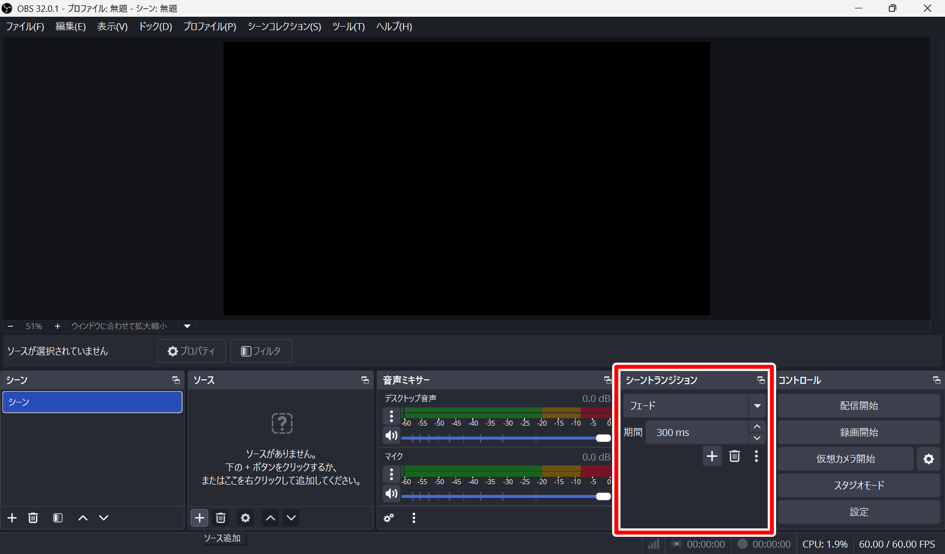 トランジションとはシーンの切り替え時に適用するエフェクトを設定する機能です。